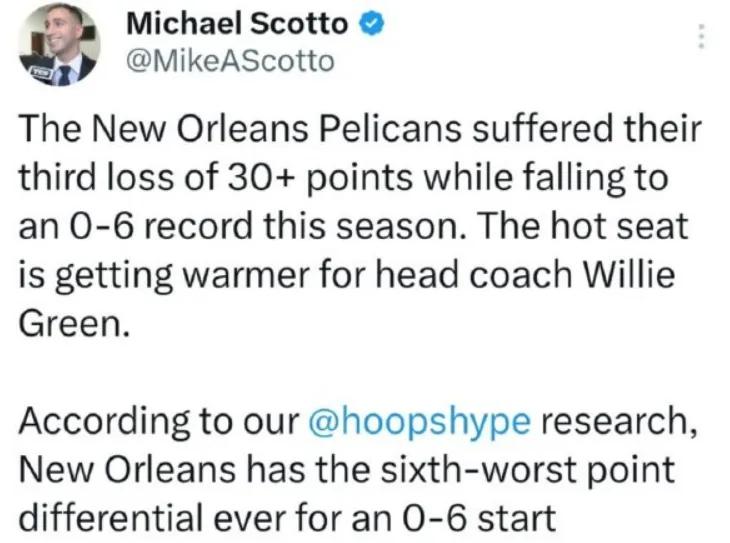 So far this season, the Pelicans have 0 wins and 6 losses. They are the only team in the Western Conference with a total loss and the only team in the league with a total loss. The Nets in the East also have 0 wins and 6 losses... The Nets, as a rebuilding team, lose It's understandable that the pants are gone, and the Pelicans are rushing to achieve results this season. They even did not hesitate to send out CJ McCollum + Olynyk + a future second-round pick this summer offseason, and poached Poole + Saddiq Bay + the 25th No. 40 pick from the Wizards.   In addition, this summer the Pelicans also signed Triple Crown center Rooney for $16 million over two years.   By the way, Poole has been a substitute for the Pelicans again and has played three consecutive games as a substitute. So far this season, he has averaged 30.8 minutes per game, scored 18.3 points, 1.7 rebounds, 3 assists and 2 turnovers. His three shooting percentages were 37.6%, 35.8% and 96.4%. He obviously failed to assume the important role of the team's outside core and lived up to expectations.   In short, the Pelicans have devoted all their efforts in trading and signings, but what they get in return is a disappointing result. Their coach Willie Green is likely to be the first coach to be dismissed this season, or the entire team will be completely destroyed and rebuilt.   Some enthusiastic netizens said that the Pelicans can trade Zion while playing badly. Next year's super draft will have the opportunity to select a new cornerstone of the team.   In September of this year, the US media "Bleachers" released the list of the 26th mock draft. The top three are Kansas University's combo guard Darin Peterson, Duke University's inside Cameron Boozer, and Brigham Young University's wing AJ DiBanza.   So far, the thin version of Zion has played in 5 of the Pelicans' six games, averaging 31.4 minutes per game, contributing 22.8 points, 6.8 rebounds, 4.6 assists, 3.4 turnovers and 2 steals. As an inside shooter, his shooting percentage is only 48.7%. The contract he is executing expires in the summer of 2028, but the 26-27 season and the 27-28 season are both non-guaranteed contracts.   The last two years of the contract are not guaranteed, which means that any team that acquires Zion has almost no burden. For example, the 19th No. 1 pick was traded in the middle of this season. If his performance does not meet expectations, he can be waived next summer without paying any price.  The so-called successor to James will not fade out of the NBA faster than the 40-year-old James, right?