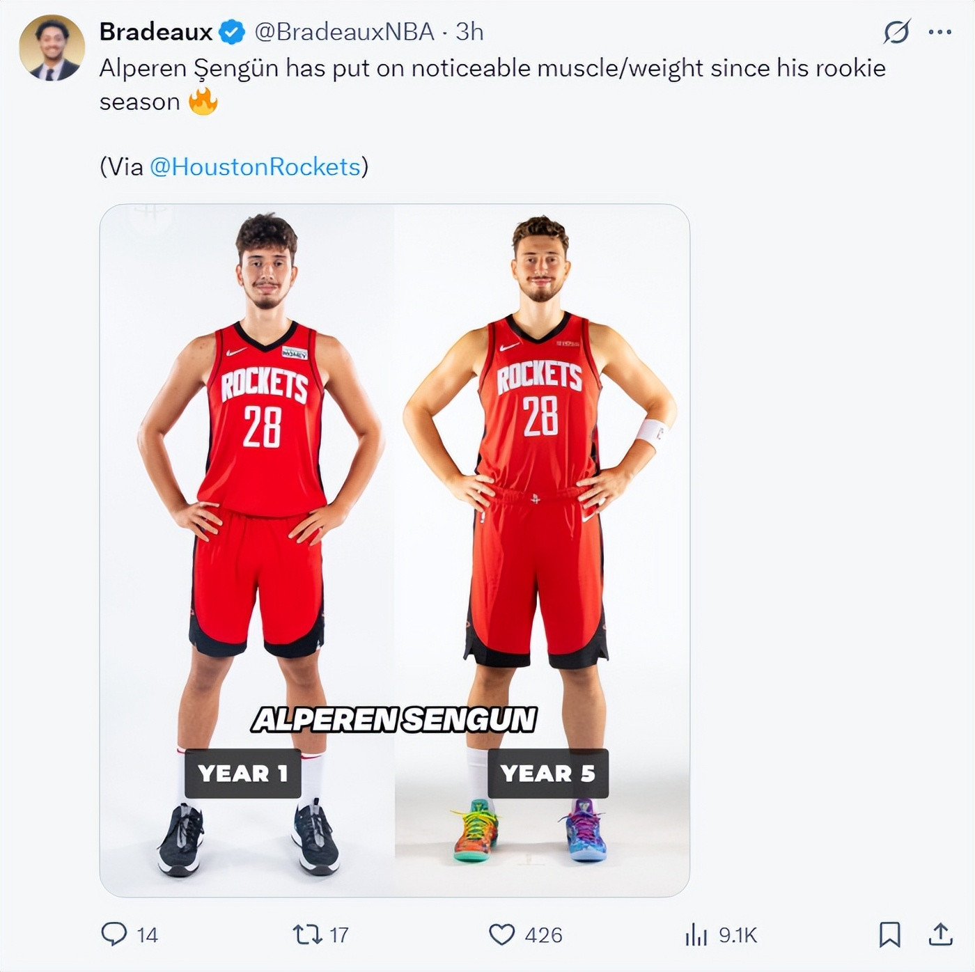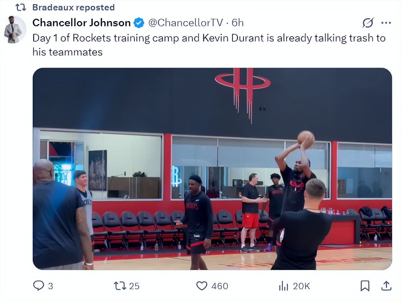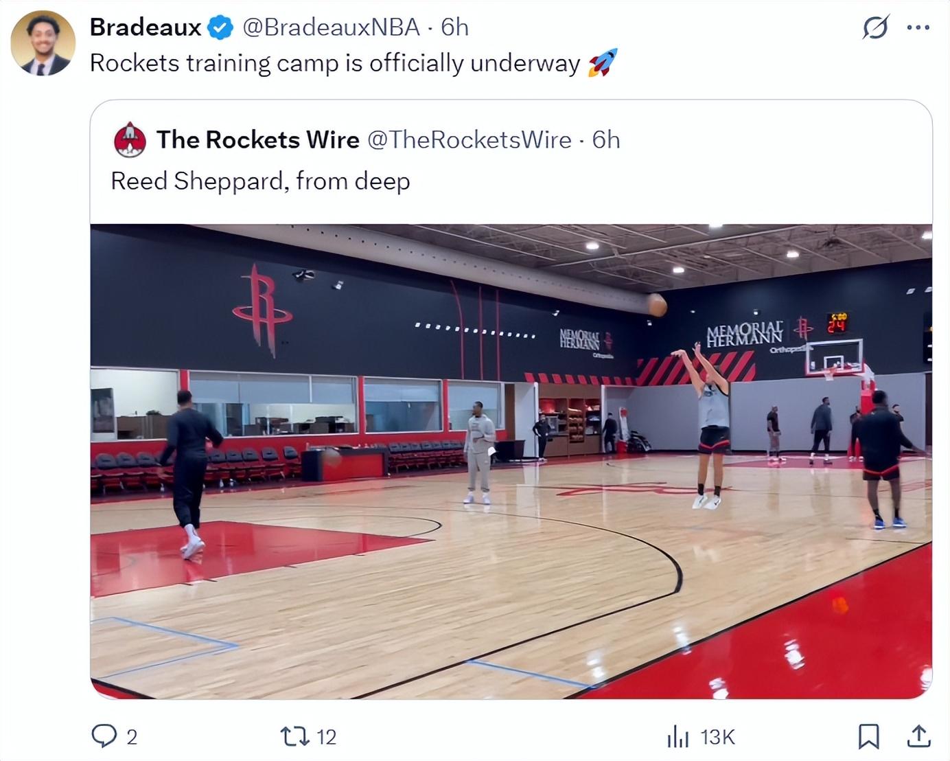 October 1, the first day of Houston Rockets training camp, which was also the first day of the Rockets' team's joint training. Except for Van Vleet who had just undergone the operation and did not participate, the rest of the players participated, including the players in the training camp contract and two-way contract. Rockets reporter Bradeaux showed off Shepard's extra training after joint training, and Shepard hit two ultra-long three-pointers in a row. Although Shepard's three-point shooting percentage was not high last season, he is actually one of the greatest three-pointers in NCAA history. If Shepard can increase her three-point shooting percentage to 38% in the new season, the Rockets' space will continue to expand. A Rockets reporter also revealed that Kevin Durant started squirting trash talk on the first day of training camp, and he squirted trash talk to his assistant coach and teammates. Just like this, Adams, Booker and others said, KD also swears trash to his own people. During the joint training, Durant should be in the first team with Xiao Jia, Shin Kyung, Holiday, and Ethan, while Amen, Shepard, Adams, Jeff Green, Capela and others were in the other team, and the colors of the jerseys were different. I feel that Xiao Jia is indeed a little taller than KD. Xiao Jia is 2.11 meters tall, but I feel that KD must be more than 2.08 meters. Shin Kyung practiced free throws. After the joint training, he went to practice free throws himself. As Shin Kyung said that in the offseason, the most training free throws and three-pointers were training free throws and three-pointers. Hot Ji posted photos of Shen Jing's makeup in the first and fifth years. It was obvious that Shen Jing's muscle-growing effect was significant, and even a little higher. Amen is the fastest-progressing player and a popular All-Star player next season. After VanVleet is reimbursed, he has more responsibilities, more ball rights, and more time on the field. There is a high probability that he will usher in a significant improvement in the data. Amen has begun to dissipate his weaknesses when he was in the second grade. He made 29.8% of his mid-range shots in the rookie season, which has increased to 38.2% last season; his bottom corner three-point shooting percentage in the rookie season was 11.1%, while he has increased to 25.9% last season. Amen's shooting progress is the biggest help to the Rockets, because the space is even greater.