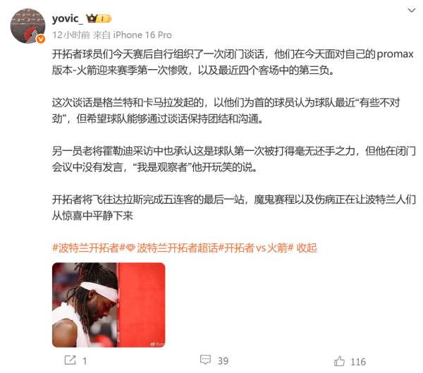 It is revealed that the Trail Blazers held an internal meeting after their defeat against the Rockets! Grant Kamara initiated the meeting and Klingen was criticized by the team reporter
