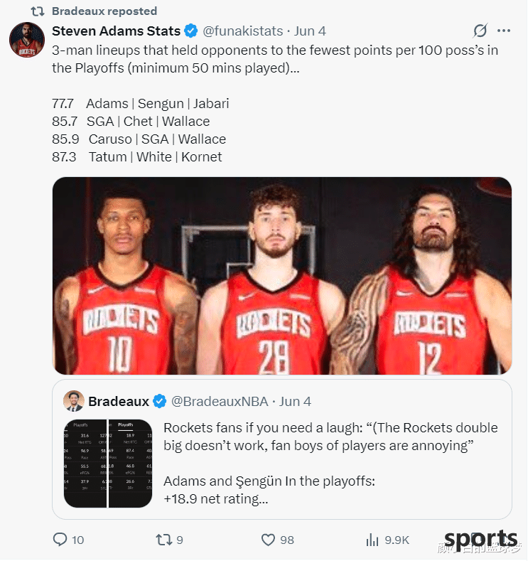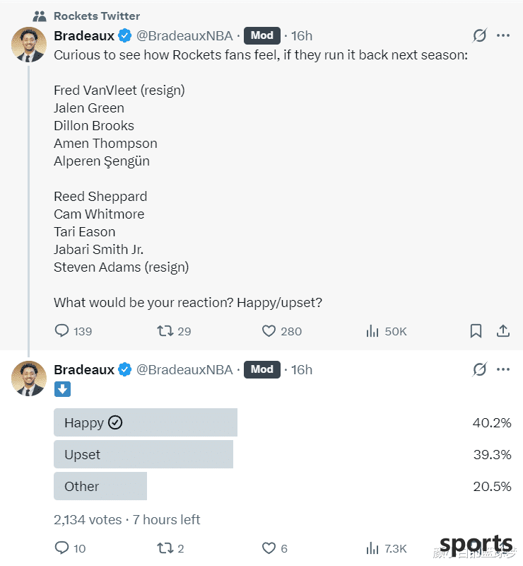 40.2% of Rockets fans chose to be happy to see this lineup, 39.3% of fans were unwilling, and 20.5% of fans had other opinions. To be honest, more Rockets fans think that this lineup can be tried for another year, because Shin Kyung's growth is amazing.