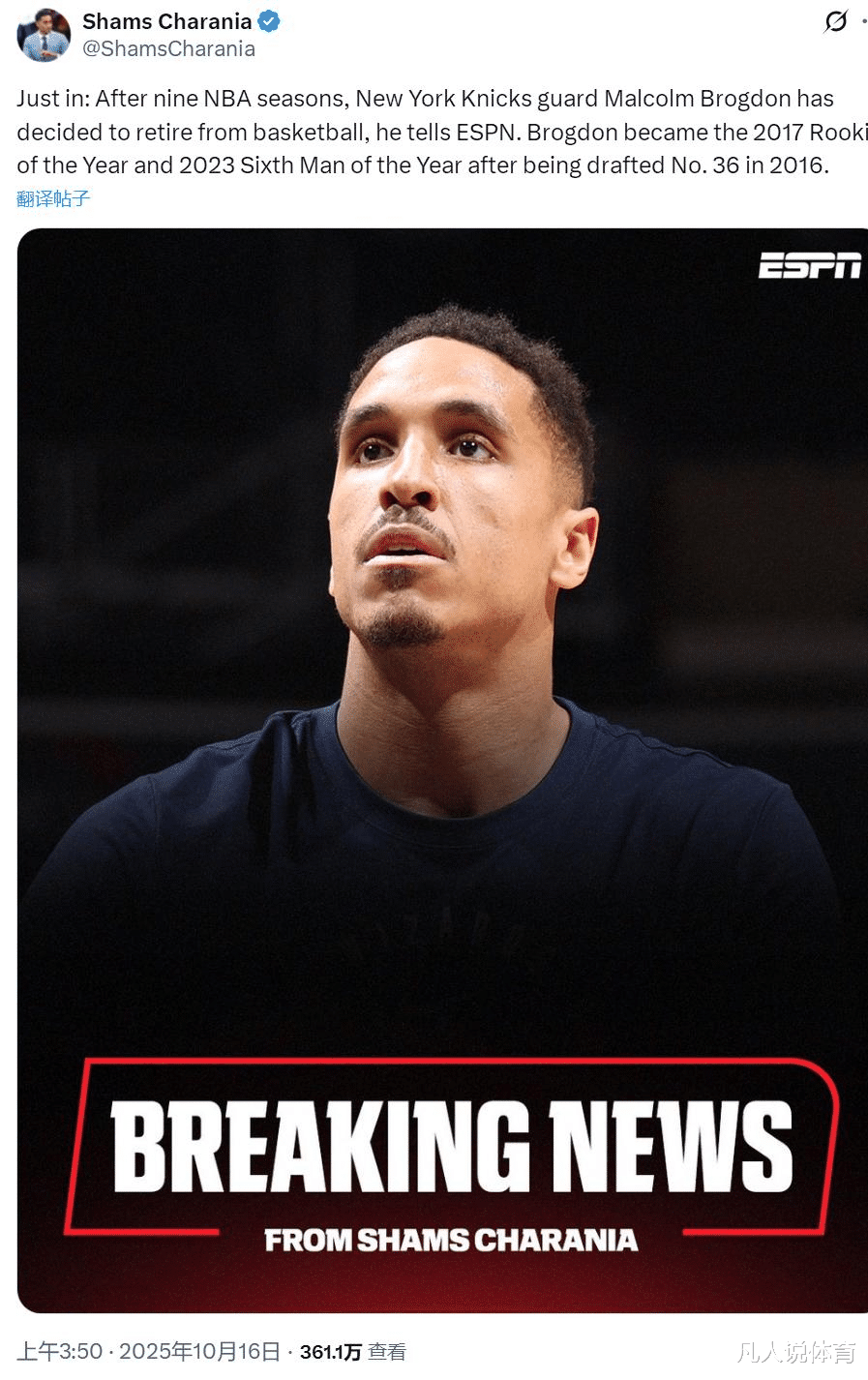 On October 16, a shocking news came from the NBA league - 32-year-old point guard Malcolm Brogdon issued a statement through ESPN, officially announcing his retirement. The former Rookie of the Year and Sixth Man of the Year winner suddenly chose to end his basketball career during the prime period of his career, surprising the entire league. It is reported that Brogdon has been considering retirement before, and he is also the only pure point guard candidate for the New York Knicks besides core guard Jaylen Brunson. The Knicks management was caught off guard by the sudden decision to retire. According to sources, Brogdon informed the Knicks management of his retirement decision on the same day, and the team was very shocked by the incident. Just a few days ago, Brogdon participated in the Knicks' preseason game and showed good competitive form. In fact, he was expected to make the Knicks' roster for the new season, providing the team with important depth support at the point guard position. Knicks reporter Bondy said in an interview: "The NBA career is too taxing, both physically and mentally. I heard that he suddenly realized during the training camp that he seemed to have lost part of his desire and fighting spirit." This statement also confirmed what Brogdon mentioned in his retirement statement that he was ready to start a new stage of life besides basketball. The retirement statement is full of affection, and he is full of emotions when looking back on his basketball career. In the retirement statement, Brogdon expressed his gratitude for his basketball career: "Today, I officially start a new stage of life beyond my basketball career. Over the past few decades, I have proudly dedicated my mind, body, and enthusiasm to the sport of basketball. . I have made a lot of sacrifices and reaped a lot of rewards. " He continued: "I am able to reach this point through my own choices, and now I am able to enjoy the fruits of my career with my family and friends. I am sincerely grateful to everyone who has supported me and accompanied me on my basketball journey." Every word in this statement reveals Brogdon's love for basketball and satisfaction with his career. He has made many achievements in his career, from a second-round pick to the best sixth man. Brogdon's NBA career can be said to be an inspirational legend. In the 2016 NBA Draft, he was selected by the Milwaukee Bucks with the 36th overall pick in the second round, becoming an "older rookie". However, he did not give up because of his low draft pick, but instead won everyone's recognition with his outstanding performance. In the 2016-17 season, Brogdon averaged 10.2 points, 2.8 rebounds and 4.2 assists per game. He was successfully elected as the NBA's Rookie of the Year, becoming the second player in history to be selected in the second round but win the Rookie of the Year award. This achievement not only proved his strength, but also laid a solid foundation for his career. In the following years, Brogdon moved to many teams, including the Indiana Pacers, Boston Celtics, Portland Trail Blazers and Washington Wizards. In the 2022-23 season, he performed well with the Celtics, averaging 14.9 points, 4.2 rebounds and 3.7 assists per game. He was successfully elected as the NBA's Best Sixth Man and became one of the best substitute players in the league. Throughout his career, Brogdon averaged 15.3 points, 4.1 rebounds, 4.7 assists, 0.8 steals and 0.2 blocks per game, shooting 45.2% from the field and 36.4% from three-point range. This kind of data performance is enough to prove that he is an excellent all-round point guard. Double physical and mental pressure, Brogdon has long thought of retiring In fact, Brogdon's retirement was not completely unexpected. Just last week after a Knicks practice, he spoke about the outside world's perception of athletes, seemingly hinting at his own inner struggles. He said: "I think those who have never experienced professional sports will always criticize top athletes, but they do not understand the hardships of this profession at all. They will not understand the load that the body will bear by maintaining top competitive levels for many years; nor will they understand the toll this sport takes on the body." These words profoundly reveal the tremendous pressure that professional athletes face. Brogdon continued: "But when you choose to become a professional player and sign a contract, you are destined to face various voices from the outside world. As a player, you can only block these interferences, because these evaluations are irrelevant. All you have to do is to work hard to stay healthy, and once healthy, you will do your best to dominate the game." It can be seen from these remarks that Brogdon has a deep understanding of the life of professional athletes and feels the hardships involved. Long-term high-intensity training and competition not only took a huge toll on his body, but also put a lot of pressure on his spirit. The Knicks have suffered a heavy blow, and the point guard position is facing a shortage. Brogdon's sudden retirement is undoubtedly a huge blow to the Knicks. As the team's only pure point guard besides Brunson, his departure left the Knicks in a labor shortage at the point guard position. As the new season is about to begin, the Knicks have to restructure their lineup. With Brogdon out of the competition, the Knicks may now only have to choose between Lance Stephenson and Wesley Matthews, both of whom are currently under major consideration and are expected to earn regular season roster spots. However, if they want to keep these two players at the same time, the Knicks still need to reduce the team's salary through other means, which will undoubtedly increase the team's operational difficulty.. For the Knicks, Brogdon's retirement not only means losing an experienced point guard, but also disrupts the team's tactical deployment and rotation arrangements. At the last moment be