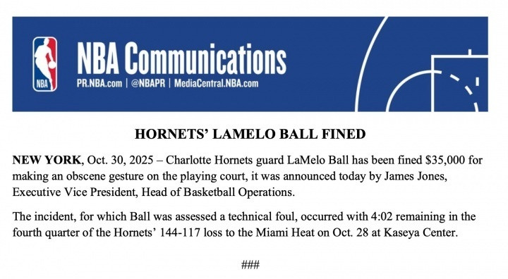 On October 31, the new NBA regular season continues. Earlier today, the NBA officially announced that Hornets star Ramelo Ball made uncivil gestures to the referee and was fined $35,000. This is also the first fine in the new NBA regular season.  In the away game against the Heat on October 29, Ball played a total of 29 minutes and made 6 of 18 shots, including 4 of 12 three-pointers and 4 of 5 free throws. He scored 20 points, 8 rebounds, 9 assists and 1 steal. In the fourth quarter of the game, Ball was called for an offensive foul in an offensive round. He was very dissatisfied with this, so he gave the referee his middle finger and received a technical foul. The Hornets eventually lost the game.   Earlier today, the NBA officially announced that Ball was fined $35,000 for making an uncivilized gesture toward the referee during the Hornets' game against the Heat. It should be noted that this is not the first time Ball has been punished for inappropriate words and deeds. As early as November 2024, he was fined $100,000 by the league for making offensive and derogatory inappropriate remarks after a game.  So far this season, Ball has averaged 26.3 points, 8.3 rebounds, 9.5 assists, 1.8 steals and 0.3 blocks per game, shooting 44.7% from the field and 39.5% from three-point range. The Hornets currently have a record of 2 wins and 2 losses, temporarily ranking 8th in the Eastern Conference.  What do you think of this matter? Welcome to give your opinions in the comment area.