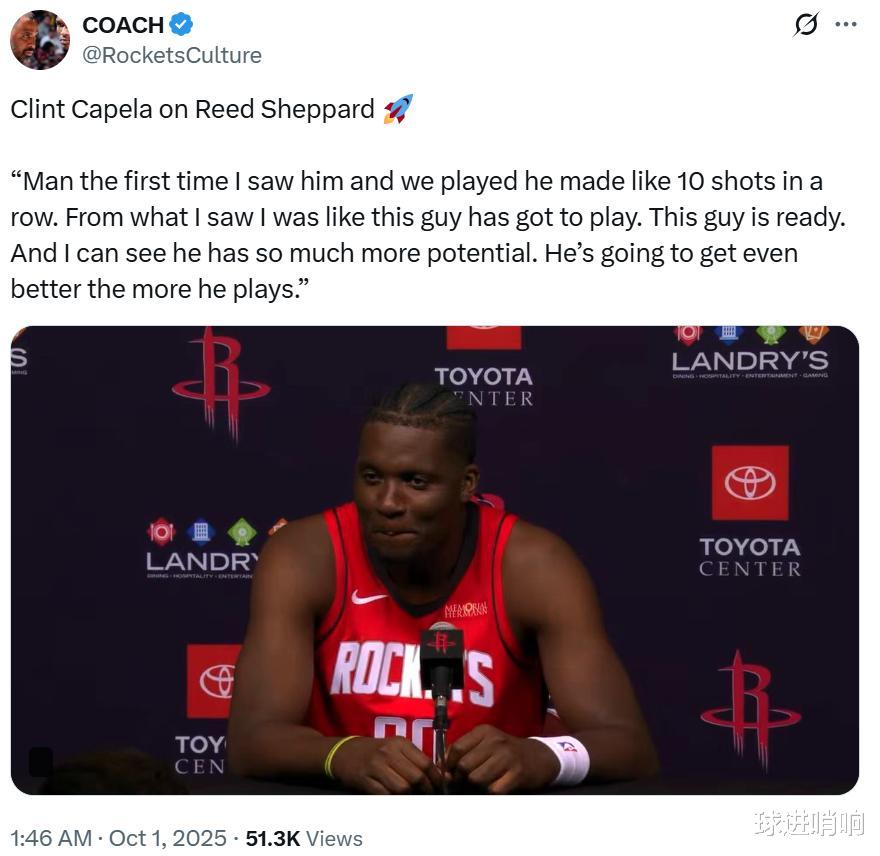 After the first day of training, "Piece King" Capela praised Shepard and said bluntly that Shepard has great potential and is ready. When he played with him for the first time, he scored 10 consecutive goals.
