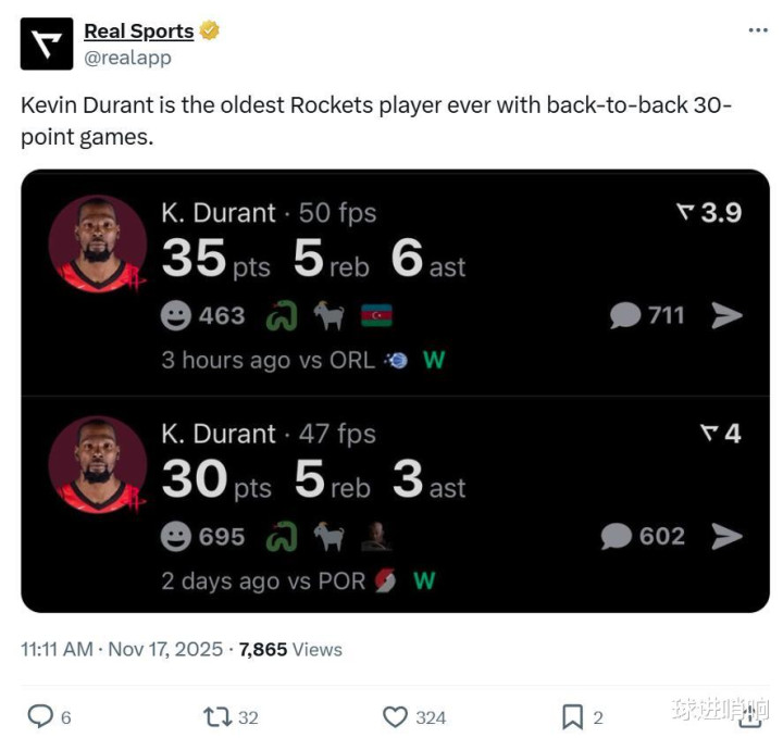 Please come to "Lant Ancestor"! Adu broke the record with 35+5+6. The Rockets won 4 consecutive victories after 5 consecutive victories, and took off with 9 wins in 10 games! The three major changes since the start of the season are gratifying, but the other two points are even more exciting. The Rockets have 9 wins in 10 games After defeating the Trail Blazers in the previous game, the Rockets faced off against the Magic. In the end, the two sides fought fiercely into overtime. The Rockets defeated the Magic 117-113 in a thrilling comeback and won 4 consecutive victories. In this way, after suffering two consecutive losses at the beginning of the season, the Rockets rebounded strongly in the past 10 games, scoring an impressive 9 wins and 1 loss. The team's overall record also improved to 9 wins and 3 losses, ranking third in the Western Conference. During this winning streak, the Rockets made three major changes. After the 8-for-1 introduction of Durant in the offseason, the Rockets have undergone a significant transformation compared to last season. Change 1: Key scorer upgrade Upgrading the key scorer from Jaylen Green to Durant through an 8-for-1 transaction is undoubtedly the Rockets' biggest upgrade this season, and this game also perfectly illustrates this. If the Rockets' previous consecutive victories could not directly demonstrate Durant's value, then this game against the Magic was suppressed throughout the game and did not reverse until the last 2 and a half minutes. The 8-for-1 introduction of Durant's value was fully demonstrated. When the team was not feeling good and could not open up the situation, it was Durant who helped the team bite the score through unsolvable stand-up singles time and time again. At the critical moment, Durant hit a 3-pointer to lead the team to take the lead. Even though a slip almost led to a big mistake in the decisive moment, when his teammates turned the tide, Durant immediately redeemed himself with an iconic mid-range shot in overtime to win the game. Durant made 13 of 24 in the game. Once again, he scored 35 points, 5 rebounds, 6 assists and 1 shot with a shooting percentage of over 50%, breaking many records in one breath. First of all, Durant, who was 37 years and 49 days old, scored 30+ points in two consecutive games, becoming the oldest player in the history of the Rockets to do so. Durant also scored 30 points in the previous game against the Trail Blazers. Secondly, after this game, Durant's career points with the Rockets exceeded 300, becoming the fastest player in Rockets history to score 300 points in only 12 games. At the same time, this is the 174th time in Durant's career that he has scored at least 30 points, 5 rebounds and 5 assists, tying Westbrook for eighth in history. This is also the epitome of Durant's hot performance since the start of the season. Especially in the past four games, Durant has been getting better and better, averaging 29.8 points, 4.5 rebounds and 5 assists per game, with three shooting percentages as high as 58.1%, 42.9%, and 88.9%. Change 2: Shen Jing’s transformation Durant and Shen Jing became the fifth duo in Rockets history to score at least 30 points, 5 rebounds and 5 assists in the same game. Shen Jing scored 30 points, 13 rebounds, 8 assists and 2 blocks. This is more worthy of praise than other records. Shen Jing finally has a helper who can stably open up the space and allow him to play one-on-one, which also helps him further transform. After Durant hit stick singles and go-ahead three-pointers time and time again to save Shen Jing's poor touch, Shen Jing also gave up the advantage when Durant slipped and gave up the advantage at the decisive moment of the regular season. First, he crucially blocked Bane to get the ball back, and then tied the game one-on-one to overtime, giving Durant the chance to finally redeem himself. When Durant was interviewed after the game, Shen Jing also stepped forward to hug his big brother tightly. Since the beginning of the season, Shen Jing has averaged 23 points, 10.3 rebounds, 7.4 assists and 1.3 steals per game, with a three-point shooting rate of 44.7%, and the lowest score in a single game is 16 points. Facing Shen Jing's performance, Durant said frankly after the game: "I am not disrespecting my previous teammates, but I have never partnered with an insider like Shen Jing before. No one can score like him in the paint." Change 3: Sheppard's growth While the two major stars delivered impressive performances, Sheppard also achieved breakthrough growth, scoring 16 points on 6-of-11 shooting, 7 rebounds, 2 assists, 1 steal and 0 turnovers, ranking first in the game in plus/minus +19. In the past five games, Shepard averaged 16.4 points, 2.6 rebounds, 3.2 assists and 2.4 steals per game, shooting 57.4% from the field and 52.9% from the three-point range. Two points are even more exciting Compared to the three gratifying changes, the Rockets' other two points are even more exciting. The first point is the team's performance after fully recovering. Ethan is currently injured, Finney Smith has not played since joining, and Van Jordan is also recovering from injuries. The second point is the performance after the running-in is completed. The Rockets are obviously still in the running-in stage. As Durant said after the game, the Rockets are still figuring out how to improve and how to end the game. The current status of Van Jordan is not that he will be reimbursed for the season. In the future, as the injured return and the whole team completes the run-in, this Rockets team is bound to become the hottest contender for the championship.