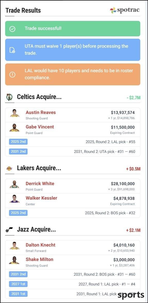 Celtics get: Reeves, Vincent, and the Lakers No. 55, and Jazz's second round in 31st year Lakers get: White, Kessler, and the Celtics No. 32. Jazz got: Kneckett, Milton, and Celtics' second round pick in 31 years, Lakers' first round in 27 years (top four protections), and Lakers' first round in 31 years.