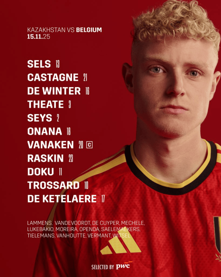Hupu News November 15th Tonight at 22:00, in the European zone of the World Cup qualifying match, Belgium played against Kazakhstan. Before the game, both sides announced the starting lineup. Belgium starting line-up: 13-Sells, 21-Castagne, 16-Dewente, 3-Tite, 2-Sais, 18-Onana, 20-Fanaken, 23-Raskin, 11-Doku, 10-Trossard, 17-Decaterale Belgian substitutes: 1-Lamens, 12-Van der Walt, 15-De Kuyper, 4-Mehler, 7-Lukebakio, 14-Morella, 9-Opponda, 22-Salemakors, 8-Tillemans, 24-Van Hoot, 25-Ferman, 6-Witsel