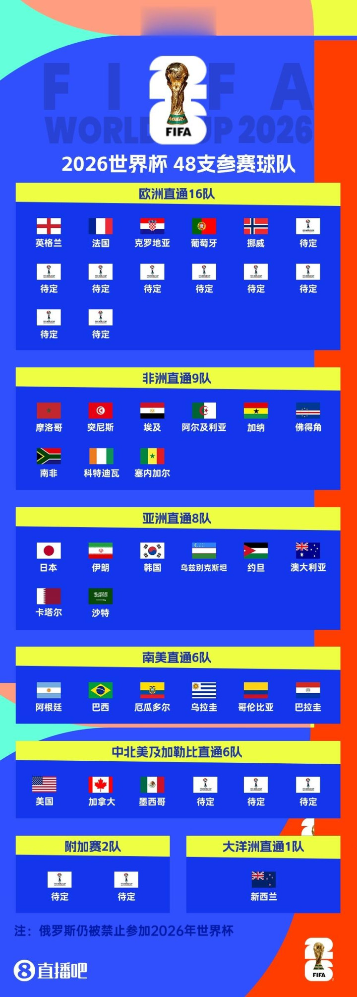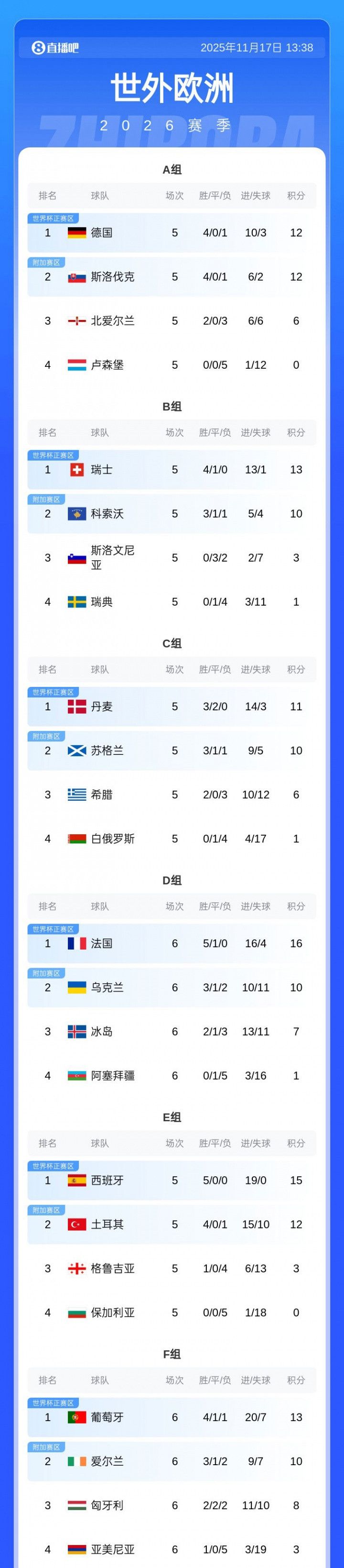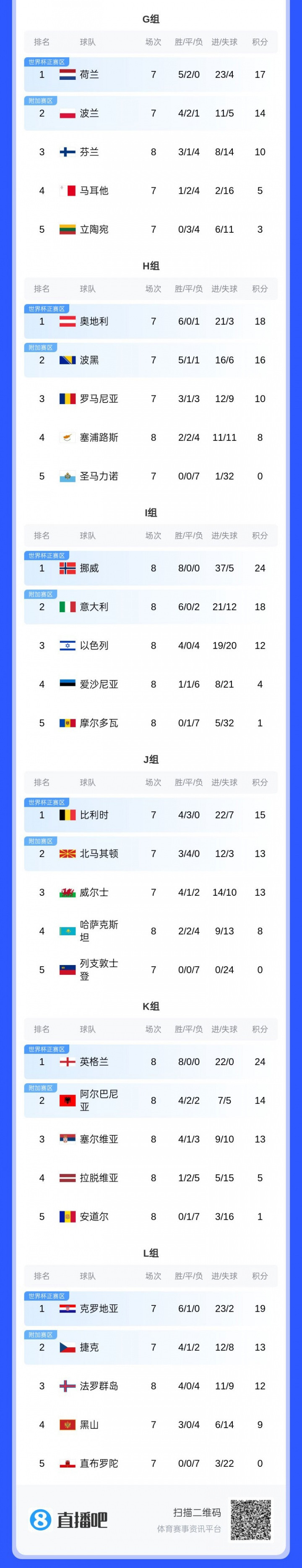The European qualifying group stage of the World Cup is coming to an end. Among the 16 direct quotas, England, France, Croatia, Portugal, and Norway have already qualified. Which other teams have a chance to advance? Which teams participate in the play-offs? Which teams have been eliminated? Let’s find out. World Cup Qualifying European Qualification Rules The 12 group firsts will directly advance to the World Cup; the 12 group second places will participate in the play-offs. In addition, the four highest-ranked group firsts in the UEFA Nations League in the 2024/25 season will also participate in the play-offs, provided that they did not finish first or second in the European qualifying group stage. Teams that advance to the first place in the group: Croatia, England, France, Norway, Portugal Teams that advance to the play-offs through the UEFA Nations League: Romania, Sweden, Northern Ireland (the other spot will be filled by North Macedonia or Wales, depending on the third place in Group J). Teams guaranteed to qualify for the play-offs at least: Austria, Bosnia and Herzegovina, Denmark, Belgium, Germany, Kosovo, Netherlands, Poland, Scotland, Slovakia, Spain, Switzerland, Turkey. Group A Germany (12 points), Slovakia (12 points), Northern Ireland (6 points), Luxembourg (0 points) November 18: Northern Ireland vs Luxembourg, Germany vs Slovakia Germany has secured the top two places. If they are unbeaten against Slovakia, they will advance as the group leaders, otherwise they will enter the play-offs. Slovakia has secured the top two spots. If they defeat Germany, they will advance as the group leader, otherwise they will enter the play-offs as the group second place. Northern Ireland cannot finish in the top two (but will enter the play-offs via the Nations League). Luxembourg is out. Group B Switzerland (13 points), Kosovo (10 points), Slovenia (3 points), Sweden (1 point) November 19: Sweden vs Slovenia, Kosovo vs Switzerland Switzerland has secured the top two spots. Unless they lose to Kosovo by six goals or more, they will advance as group leaders; if they lose by six goals or more, Switzerland will enter the play-offs. Kosovo has secured the top two spots. If Switzerland is defeated by six goals or more, it will advance as the group leader; otherwise Kosovo will enter the play-offs. Slovenia is out. Sweden cannot enter the top two (but will enter the play-offs through the UEFA Nations League). Group C Denmark (11 points), Scotland (10 points), Greece (6 points), Belarus (1 point) November 19: Scotland vs Denmark, Belarus vs Greece Denmark has secured the top two spots. Unless they lose to Scotland, they will advance as group leaders; if they lose, Denmark will advance to the play-offs. Scotland have secured the top two spots. If they beat Denmark they will advance as group leaders, otherwise Scotland will enter the play-offs. Greece and Belarus have been eliminated. Group D France (16 points), Ukraine (10 points), Iceland (7 points), Azerbaijan (1 point) France has advanced as the group leader. Ukraine will enter the play-offs in second place in the group. Iceland ultimately ranked third and missed the 2026 World Cup. Azerbaijan ultimately ranked fourth and missed the 2026 World Cup. Group E Spain (15 points), Turkey (12 points), Georgia (3 points), Bulgaria (0 points) November 19: Bulgaria vs. Georgia, Spain vs. Turkey Spain has secured the top two spots. Unless they lose to Türkiye by seven goals or more, they will advance as group leaders; if they lose by seven goals or more, Spain will enter the play-offs. Türkiye has secured the top two spots. If Spain is defeated by seven goals or more, it will advance as the group leader; otherwise Türkiye will enter the play-offs. Georgia and Bulgaria have been eliminated. Group F Portugal (13 points), Ireland (10 points), Hungary (8 points), Armenia (3 points) Portugal has advanced as the group leader. Ireland entered the play-offs as second in the group. Hungary ultimately ranked third and missed the 2026 World Cup. Armenia ultimately ranked fourth and missed the 2026 World Cup. Group G Netherlands (17 points), Poland (14 points), Finland (10 points), Malta (5 points), Lithuania (3 points) November 18: Malta vs Poland, Netherlands vs Lithuania The Netherlands has secured the top two places. If they go undefeated against Lithuania, or if Poland fails to defeat Malta, the Netherlands will advance as group leaders. If the Netherlands loses and Poland wins, the two teams will determine the first and second place in the group in the following order: total goal difference, total goals, away goals of the relevant team, disciplinary points, and draw. Poland has secured the top two spots. If Poland fails to defeat Malta, or the Netherlands is undefeated against Lithuania, Poland will be ranked second and enter the play-offs. If Poland wins and the Netherlands loses, the two teams will determine first and second place in the group based on the above criteria. Finland, Malta, and Lithuania are eliminated. Group H Austria (18 points), Bosnia and Herzegovina (16 points), Romania (10 points), Cyprus (8 points), San Marino (0 points) November 19: Austria vs Bosnia and Herzegovina, Romania vs San Marino Austria has secured the top two spots. Unless they lose to Bosnia and Herzegovina, they will advance as group leaders; if they lose, Austria will enter the play-offs. Bosnia and Herzegovina has secured the top two spots. If they defeat Austria, they will advance as group leaders, otherwise Bosnia and Herzegovina will enter the play-offs. Romania cannot reach the top two (but will enter the play-offs through the UEFA Nations League). Cyprus and San Marino are eliminated. Group I Norway (24 points), Italy (18 points), Israel (12 points), Estonia (4 points), Moldova (1 point) Norway has advanced as the group leader. Italy will enter the play-offs as second place in the group. Israel finally ranked third and missed the 2026 World Cup. Estonia ultimat