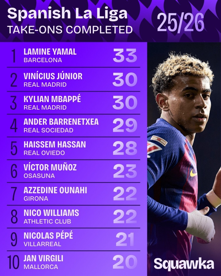 La Liga dribble list this season: Yamal ranked first with 33 times, Vinicius and Mbappe tied for second with 30 times