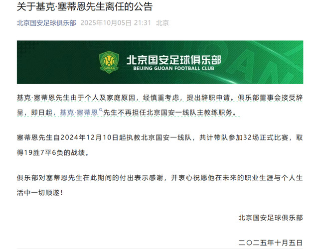 On the evening of October 5, Beijing Guoan Football Club officially issued an "Announcement on Mr. Kirk Setien's Resignation". The announcement stated that Mr. Kirk Setien applied for resignation after careful consideration due to personal and family reasons. The club's board of directors accepts resignation and from now on, Mr. Kirk Setien will no longer serve as the head coach of Beijing Guoan's first team.
