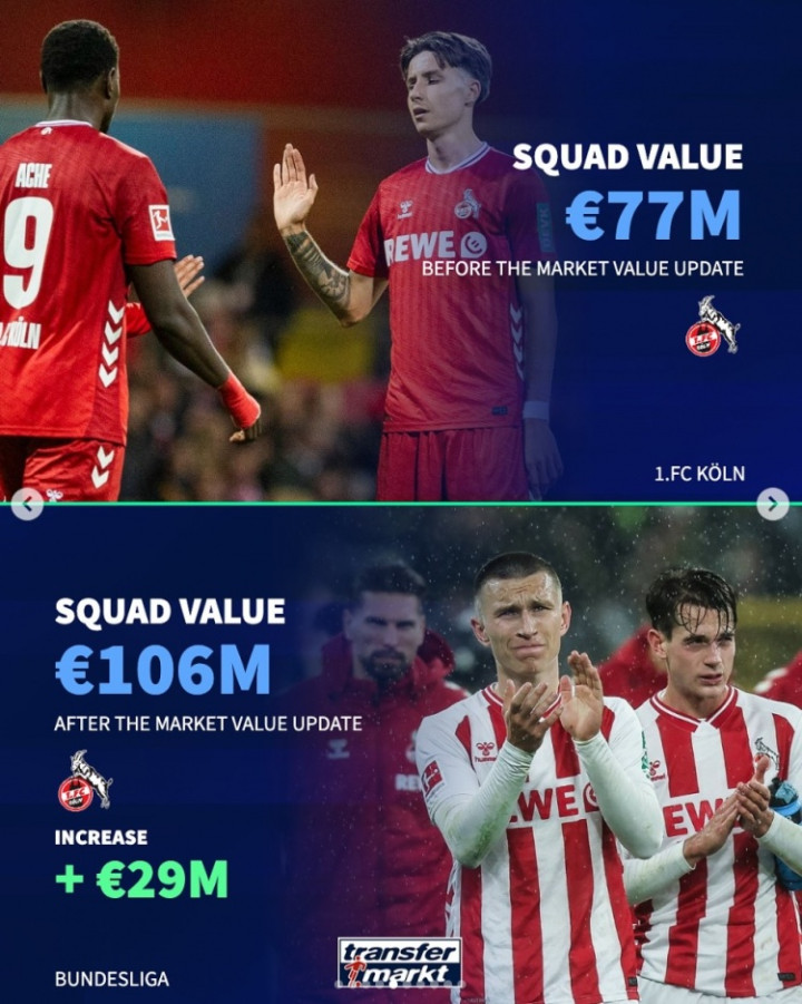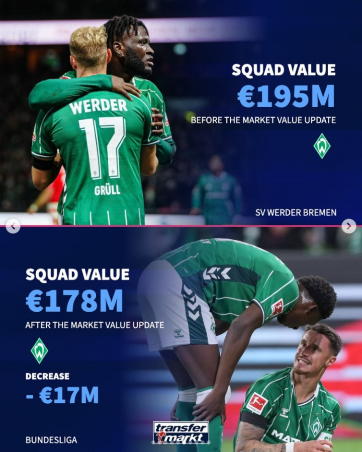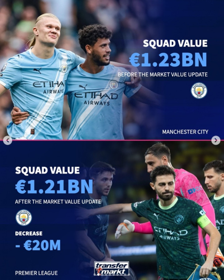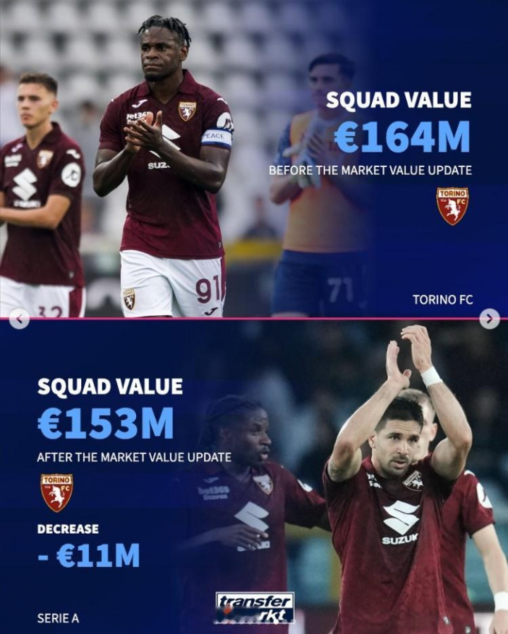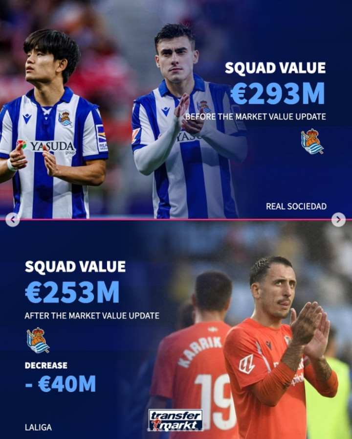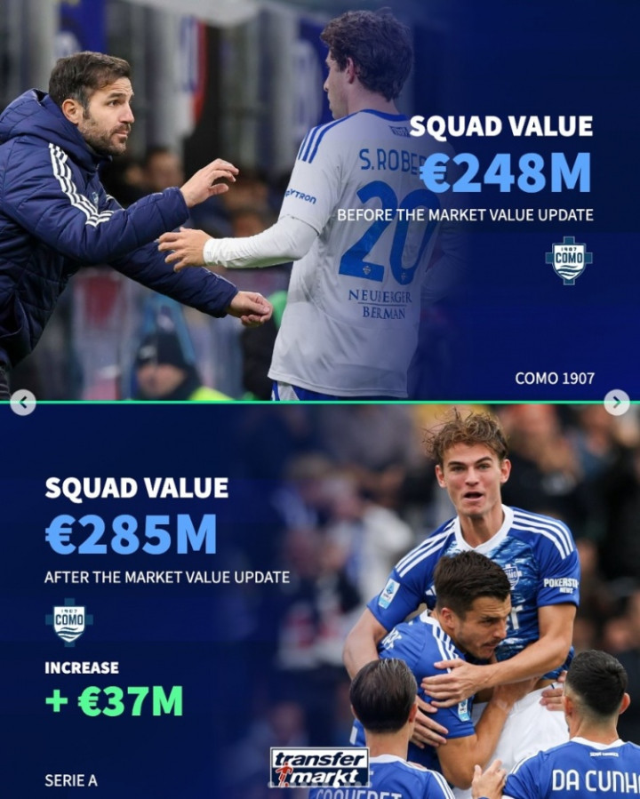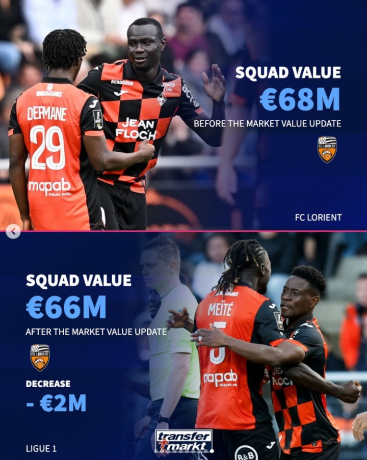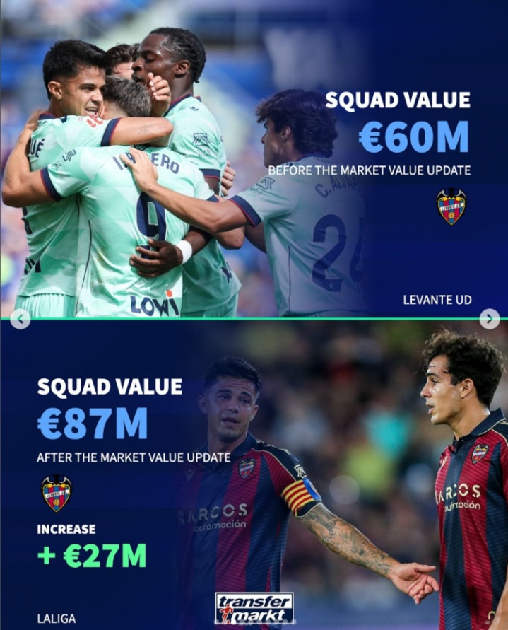 October 27th "Transfer Market" has recently updated the value of the teams in the five major leagues. They have also listed the teams with the largest increase and decrease in value (in euros) after the latest price update in each major league. Premier League: Sunderland +50 million: 290 million → 340 million Manchester City - 20 million: 1.23 billion → 1.21 billion La Liga: Levante +2 7 million: 60 million → 87 million Real Sociedad - 40 million: 293 million → 253 million Bundesliga: Cologne + 29 million: 77 million → 106 million Werder Bremen - 17 million: 195 million → 178 million Serie A: Como + 37 million: 248 million → 285 million Turin - 11 million: 164 million → 153 million Ligue 1: Angers +7 million: 26 million → 33 million Lorient - 2 million: 68 million → 66 million