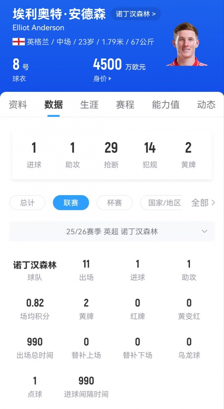 On November 11, Xunde Sky reporter Plettenberg reported that Manchester United is interested in Forest midfielder Anderson. The reporter wrote: "I learned that Manchester United is still keen on Elliot Anderson and has developed specific interest in him. Nottingham Forest has received the news and still requires a fee of 100 million to 120 million pounds." 23-year-old Forest midfielder Elliot Anderson has played 11 times in the league for Forest this season, contributing 1 goal and 1 assist. His current transfer price in Germany is 45 million euros.