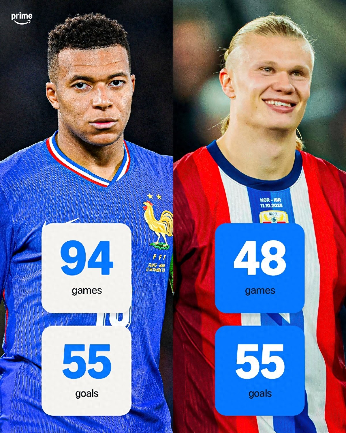 The number of goals scored by the new double pride of the national team: Haaland tied Mbappe with 55 goals, only half the games needed