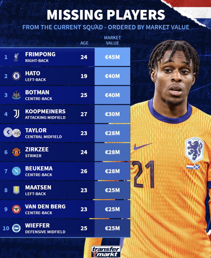 The value list of players who were not selected for the current Dutch team: Frimpong, Hutto and Botman ranked among the top three