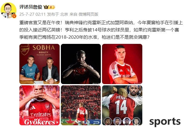 July 27th Arsenal officially announced that Yorke officially joined the team. Commentary Zhan Jun posted: "The heavy announcement is midnight again! Swedish god forward Yorke officially joined Arsenal. This summer window, the Gunners invested nearly 200 million pounds in signings! Among the players wearing the No. 14 jersey after Henry, if Yorke can be as good as Aubameyang in 2018-2020 in the first season, will Gunners fans be satisfied?" 2018/19 and 2019/20 seasons, Aubameyang scored 31 goals and 29 goals for Arsenal respectively.